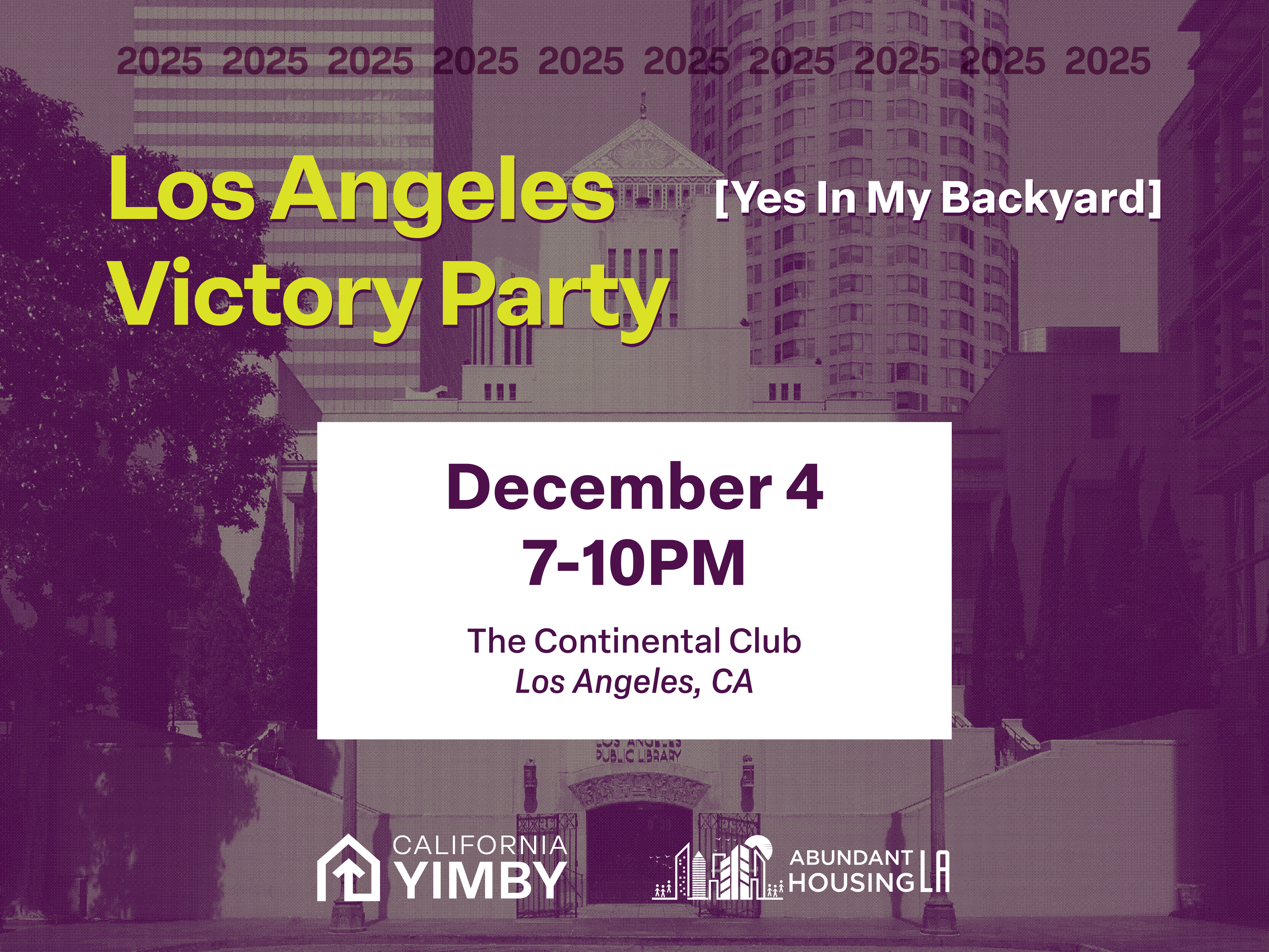 Join Abundant Housing Los Angeles and California YIMBY for the 2025 Victory Party in Los Angeles! This year we have much to celebrate, including our landmark victory in reforming CEQA to exempt infill housing.