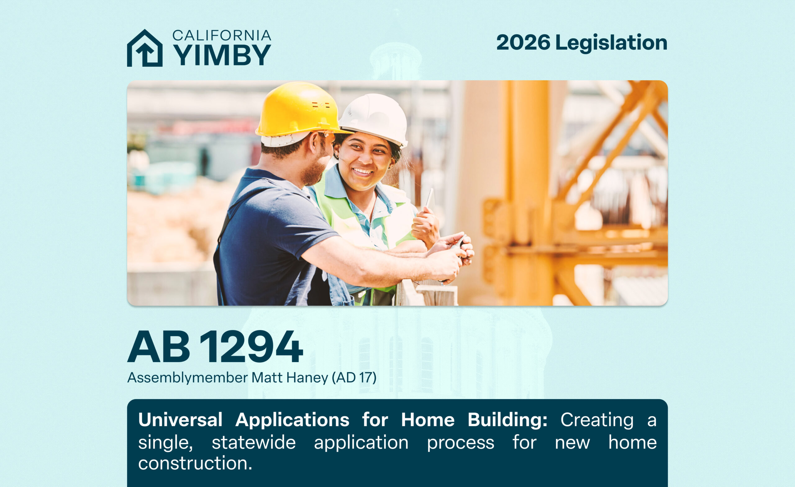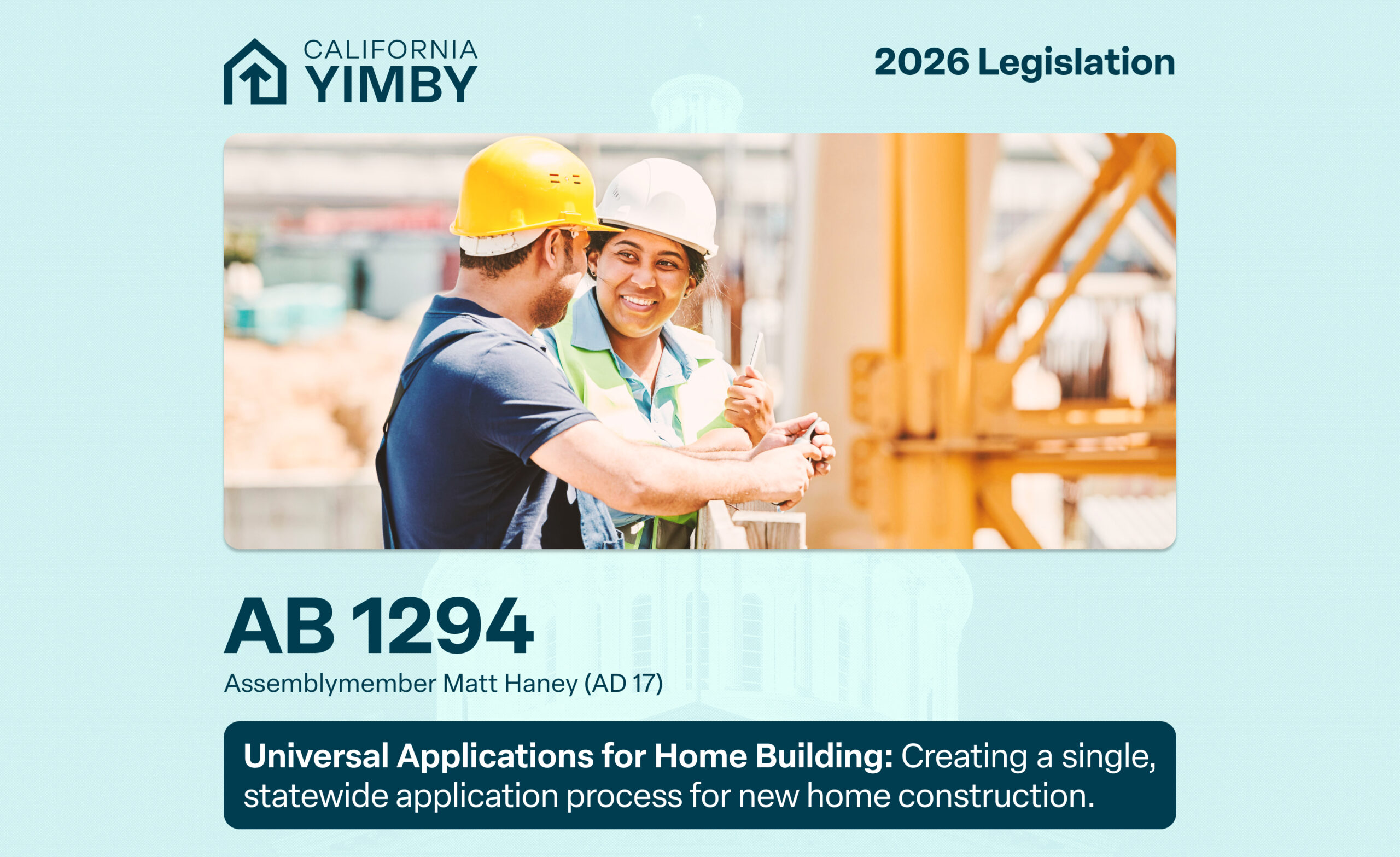 AB 1294 creates a single, statewide application process for new home construction in California, making it faster, cheaper, and easier for home builders to complete the application process.