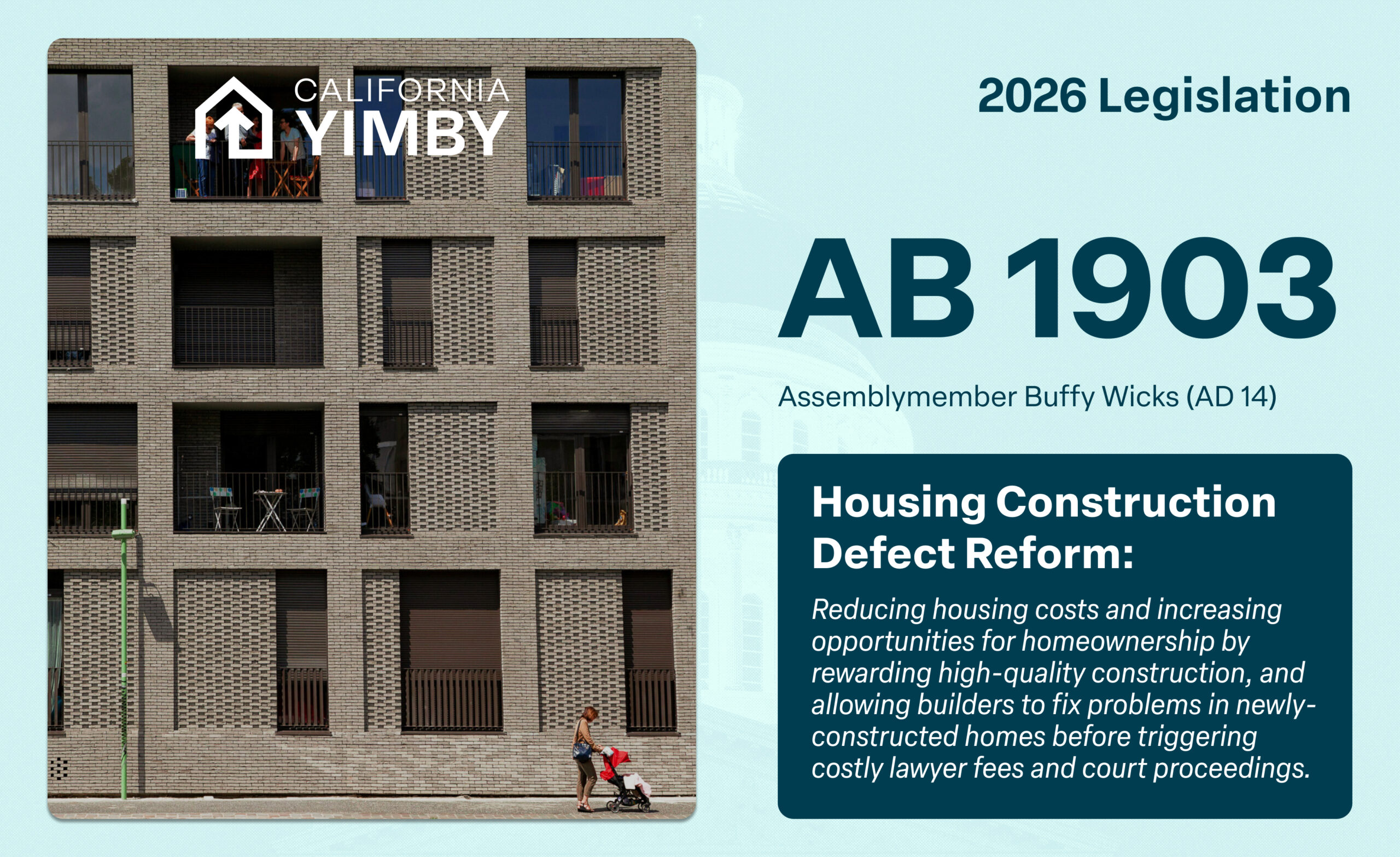 AB 1903 will reduce housing costs and increase opportunities for homeownership by rewarding high-quality construction, and allowing builders to fix problems in newly-constructed homes before triggering costly lawyer fees and court proceedings.