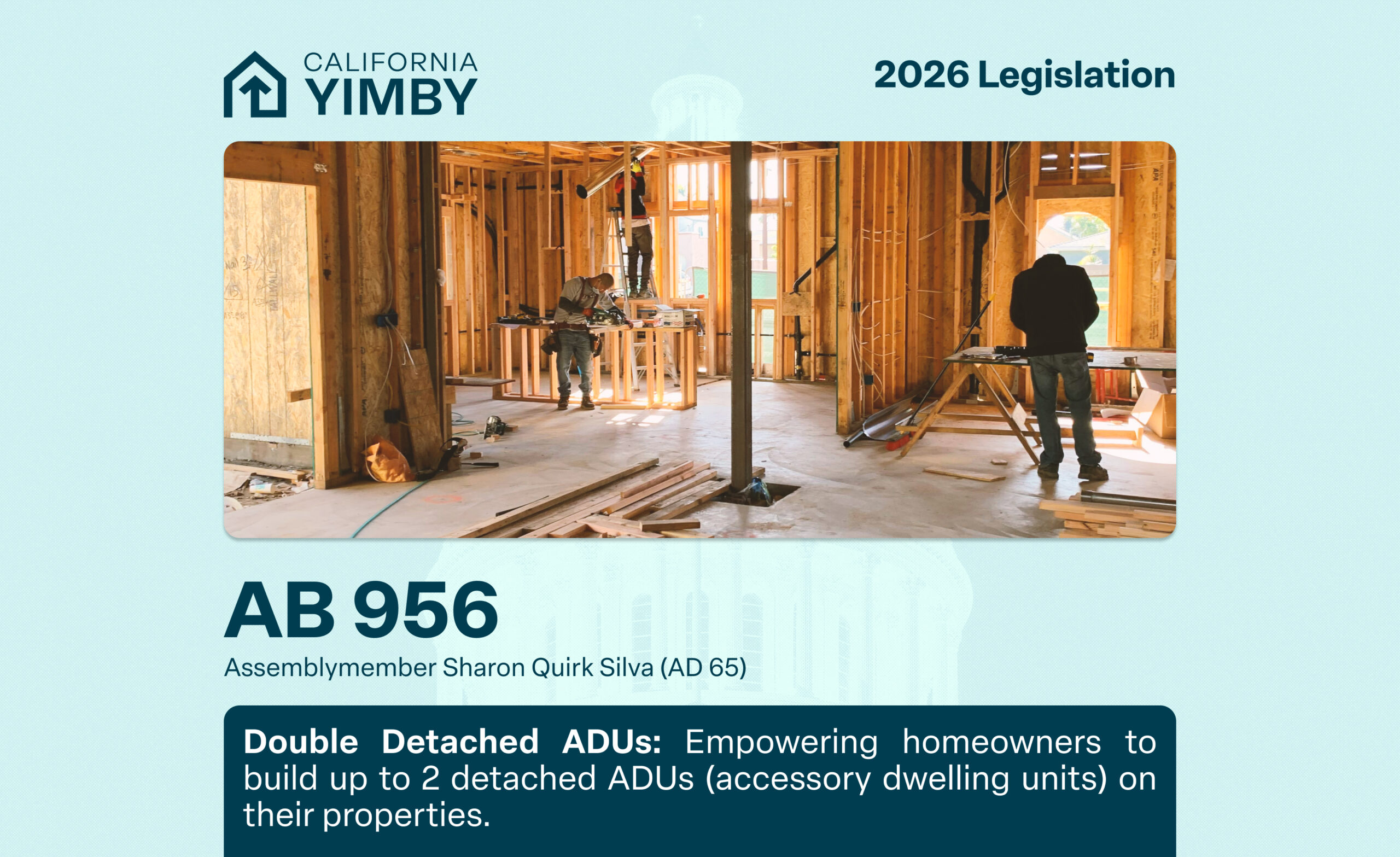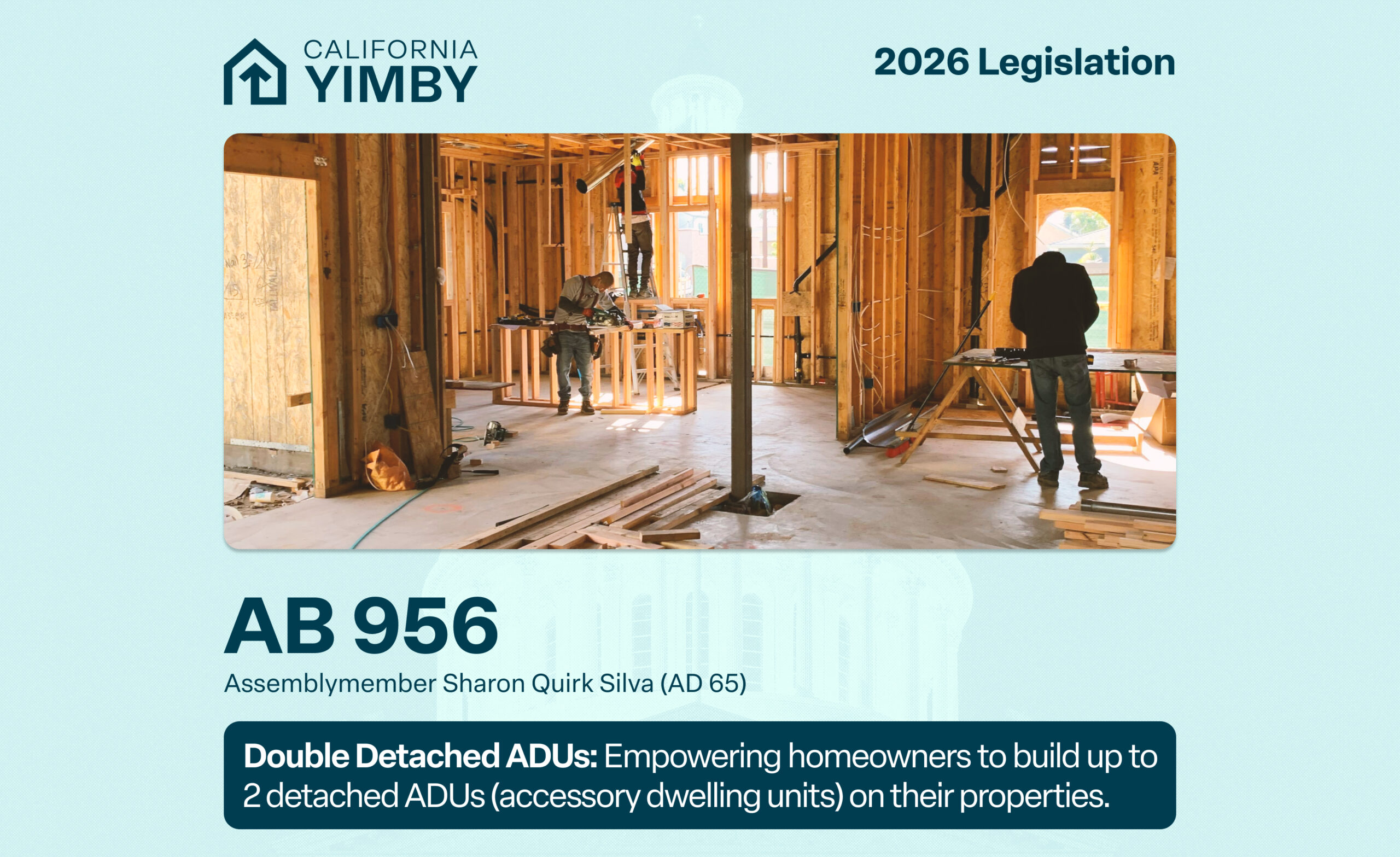 AB 956 will increase the housing potential of single-family lots by empowering homeowners to build up to two detached ADUs (accessory dwelling units) on their properties.