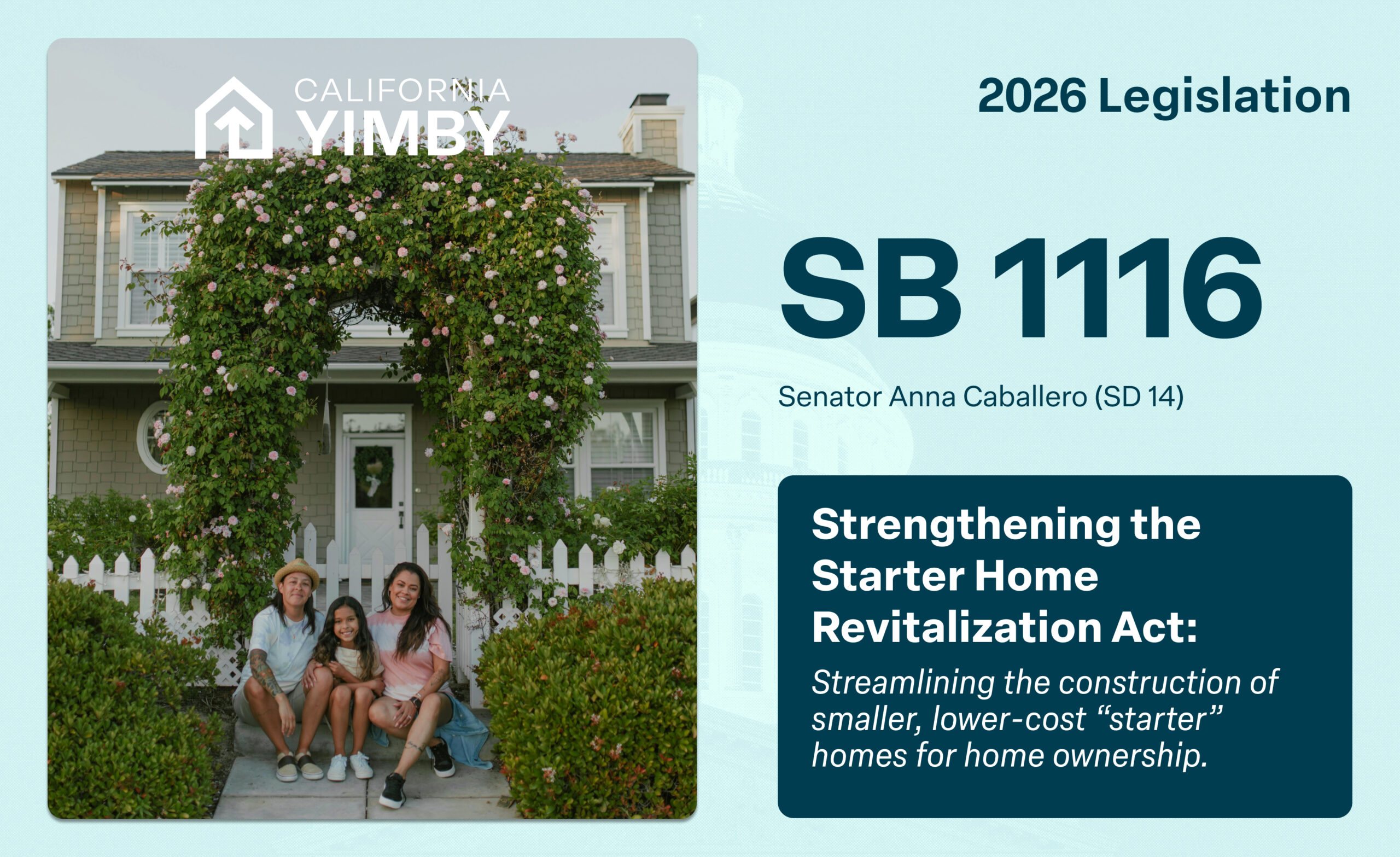 SB 1116 will streamline the construction of smaller, lower-cost “starter” homes for home ownership by making several improvements to existing state housing law.